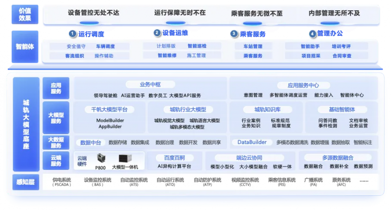 方案依托百度智能云千帆?模型平臺和交通多模態(tài)?模型能?,構(gòu)建了城軌?模型底座,提供從算?資源管理到多模態(tài)數(shù)據(jù)處理再到?模型開發(fā)及模型訓(xùn)練,以及企業(yè)級?模型開發(fā)的全鏈路能?,可?效?撐運?調(diào)度、設(shè)備運維、乘客服務(wù)與職能辦公四?城軌核?場景的智能體建設(shè)。