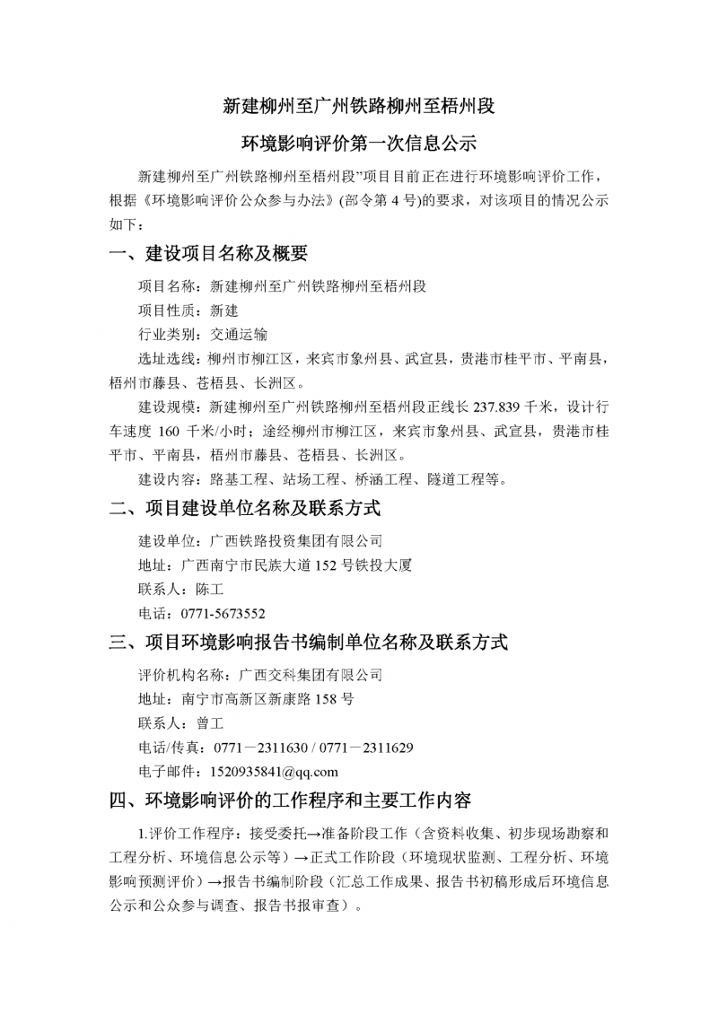 近日,廣西鐵路投資集團有限公司官網發(fā)布了《新建柳州至廣州鐵路柳州至梧州段環(huán)境影響評價第一次信息公示》。