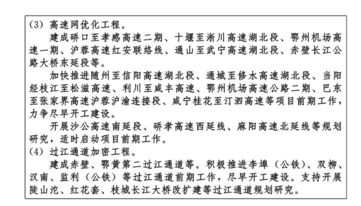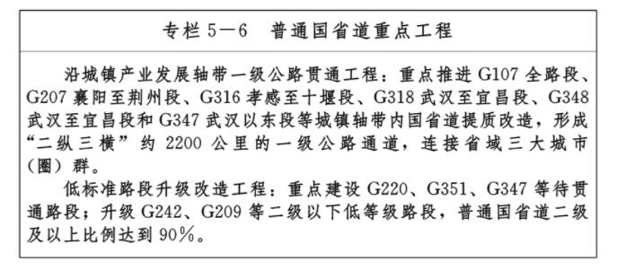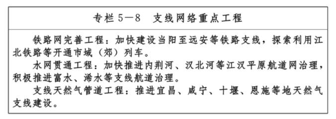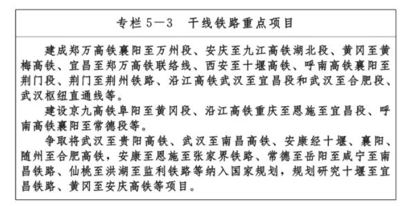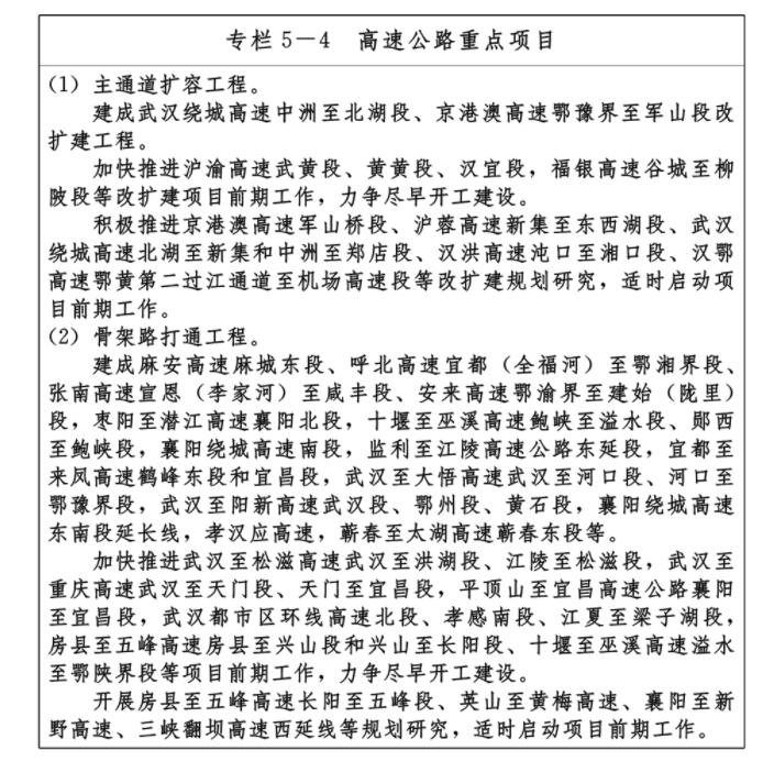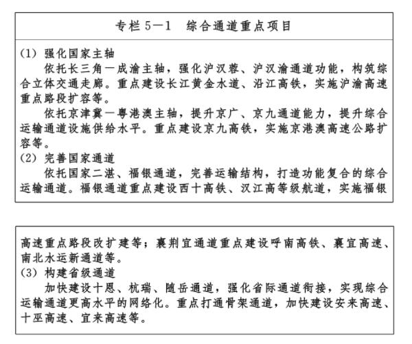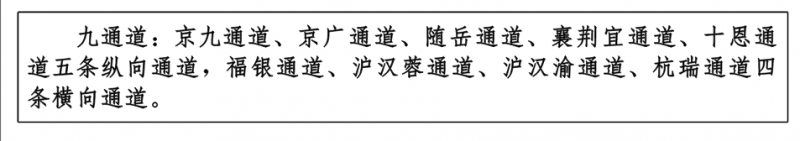 ——九通道:優(yōu)化、提升、完善南北方向京九、京廣、隨岳、襄荊宜、十恩和東西方向福銀、滬漢蓉、滬漢渝、杭瑞等“五縱四橫”九條綜合交通運輸大通道,形成與城鎮(zhèn)發(fā)展軸和重要產(chǎn)業(yè)帶有機銜接、溝通周邊城市群和各大經(jīng)濟區(qū)、聯(lián)通國際的綜合運輸通道布局。