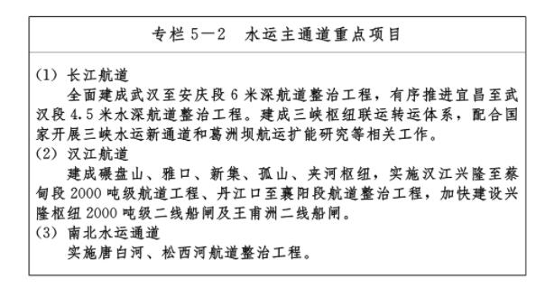 ——兩走廊:打造長江、漢江綜合立體交通運輸走廊,重點發(fā)揮黃金水道優(yōu)勢,優(yōu)化完善各交通方式布局,支撐和引導(dǎo)優(yōu)勢資源和產(chǎn)業(yè)向“兩走廊”集聚,聯(lián)動長江經(jīng)濟帶、漢江生態(tài)經(jīng)濟帶一體化發(fā)展。長江綜合立體交通運輸走廊重點推進長江航道系統(tǒng)治理,統(tǒng)籌沿江港口功能布局,推進快速通道建設(shè),提升過江通道能力。漢江綜合立體交通運輸走廊重點推進漢江梯級開發(fā)和系統(tǒng)治理,推動沿江港口干支聯(lián)動,完善各交通方式網(wǎng)絡(luò)。