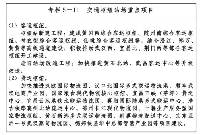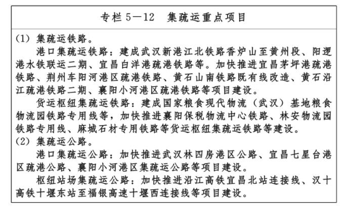 提升綜合交通樞紐地位,建設(shè)樞紐集群、樞紐城市、樞紐港站“三位一體”的綜合交通樞紐系統(tǒng),著力建設(shè)一流內(nèi)河港口,打造具有全球競爭力的現(xiàn)代化機場群,優(yōu)化鐵路樞紐布局,實施湖北國際物流核心樞紐等一批客貨運樞紐項目,完善樞紐集疏運體系,打造銜接高效、輻射廣泛的九省通衢大樞紐。