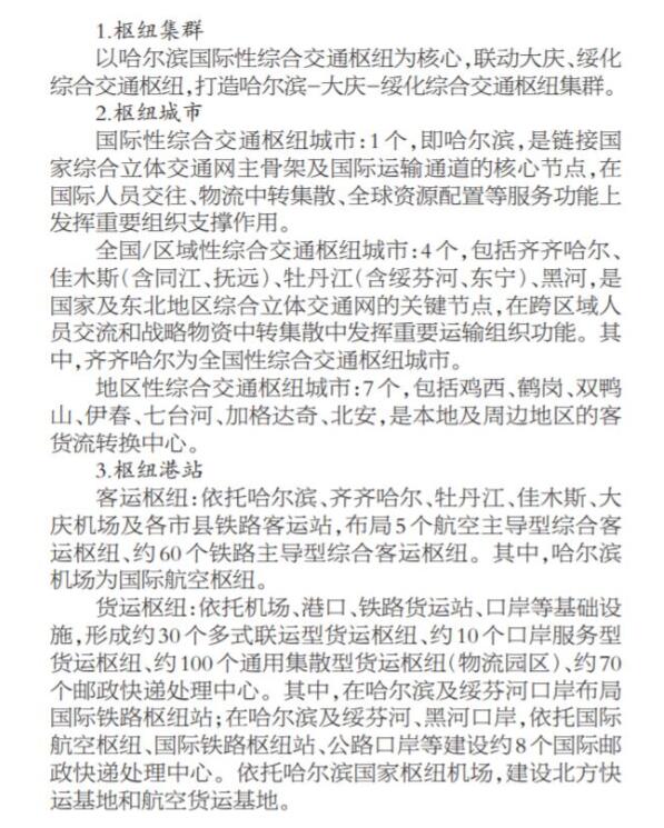 建成哈爾濱(哈大綏)國際性綜合交通樞紐城市,形成黑龍江省輻射東北、聯(lián)動國內(nèi)、聯(lián)通全球的核心樞紐;建成齊齊哈爾等全國/區(qū)域性綜合交通樞紐城市和一批高效能、多層次、廣覆蓋的客貨樞紐港站。