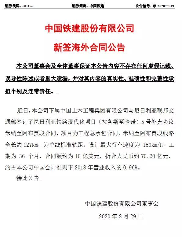 鐵建最新公告稱(chēng):旗下土木工程集團(tuán)有限公司與尼日利亞聯(lián)邦交通部簽訂了尼日利亞鐵路現(xiàn)代化項(xiàng)目(拉各斯至卡諾)5 號(hào)補(bǔ)充協(xié)議米納至阿布賈段合同,項(xiàng)目為工程總承包合同。