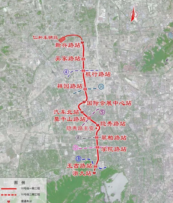 杭州地鐵10號線一期線路全長15.1公里,均為地下線,設12座車站。設車輛段1處(仁和車輛段),主變電所1處(隱秀路主變)。車輛采用A型車6輛編組,列車最高運行速度80公里。項目總投資為157.02億元。施工期2017年至2022年。