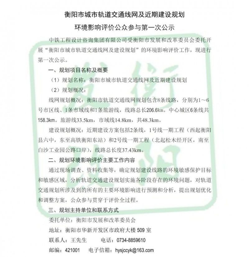 6月19日上午,衡陽市發(fā)改委官方公眾號發(fā)布了衡陽市城市軌道交通線網(wǎng)及近期建設(shè)規(guī)劃環(huán)境影響評價公眾參與第一次公示。