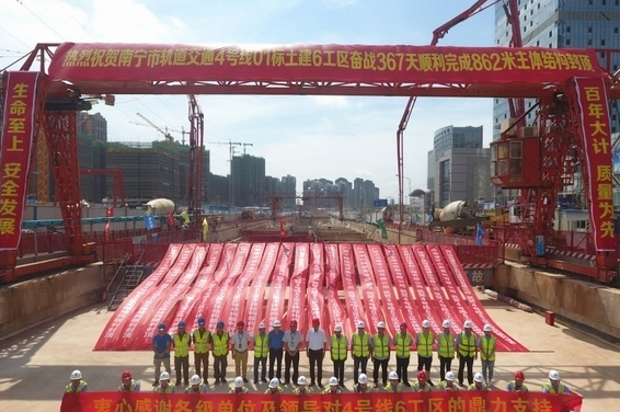 6月20日,隨著最后一方混凝土的澆筑,南寧軌道交通4號線最長深基坑——862m的飛龍路站至體育中心西站(兩站一區(qū)間)基坑主體結(jié)構(gòu)順利封頂。至此,南寧軌道交通4號線19個車站已封頂12個。