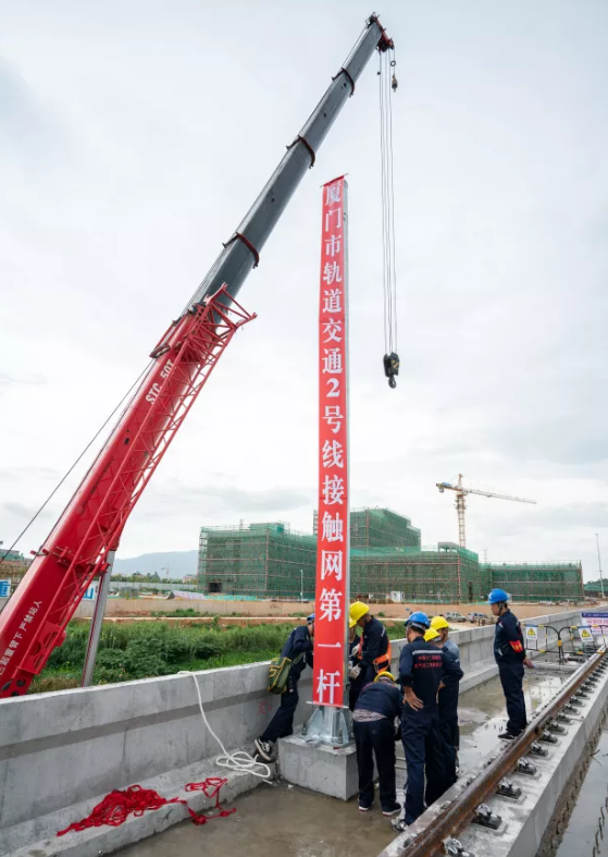 6月22日上午10時(shí),廈門地鐵2號(hào)線海滄東孚車輛段吊車將接觸網(wǎng)支柱吊裝在基座上施工人員對(duì)支柱進(jìn)行安裝固定“第一桿”的成功安裝標(biāo)志著地鐵2號(hào)線供電系統(tǒng)進(jìn)入實(shí)質(zhì)性施工階段,