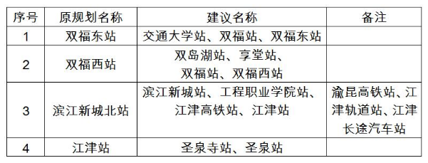 請(qǐng)廣大市民關(guān)注江津區(qū)政府門戶網(wǎng)、江津日?qǐng)?bào)、江津網(wǎng)、江津區(qū)建委網(wǎng),如對(duì)上述車站站名有異議(可另推薦站名),請(qǐng)于2018年7月3日前,反饋至重慶市江津區(qū)軌道交通建設(shè)指揮部辦公室(電話/傳真:023-47587186)或發(fā)送Email至184502043@qq.com,公示結(jié)束后若無異議,重慶市江津軌道建設(shè)有限公司將正式為江津境內(nèi)4個(gè)站點(diǎn)申報(bào)名稱。