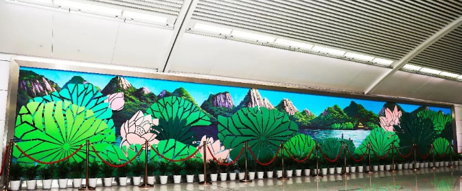 來到車站B口端墻,這里是“清風(fēng)站”的多媒體互動(dòng)展示區(qū)。多媒體互動(dòng)系統(tǒng)生動(dòng)地展示了蓮花的綻放過程,在青山綠水的景色中綻放出美麗的花朵。每當(dāng)有乘客由此經(jīng)過,腳下會(huì)舒展開一片片蓮葉,綻放出一朵朵蓮花,寓意“出淤泥而不染,濯清漣而不妖”。