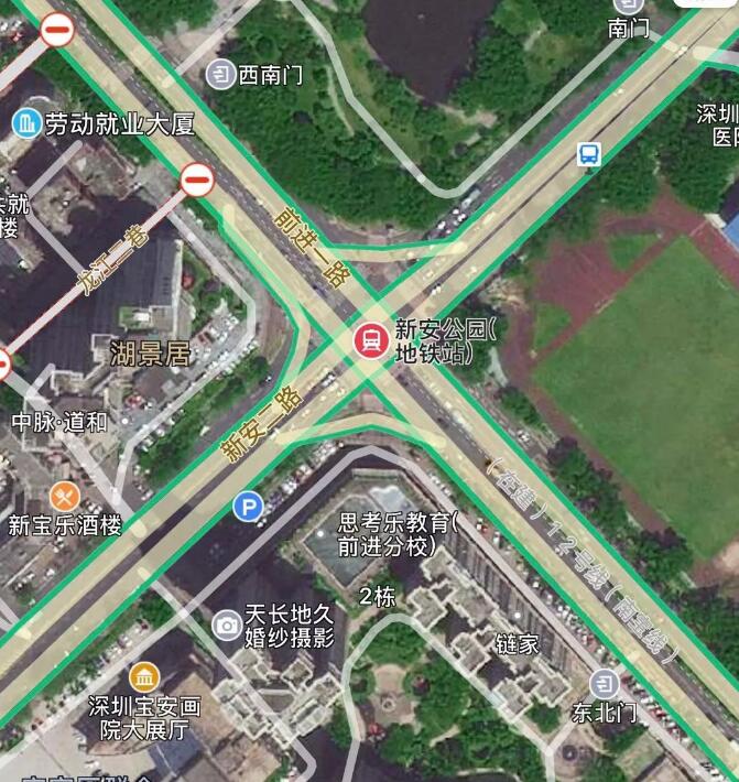 新安公園站位于新安二路與新圳路之間,沿前進(jìn)一路南北向布置形成交叉口,交通情況復(fù)雜。為了在穩(wěn)步推動(dòng)地鐵建設(shè)的同時(shí)有效保障周邊市民出行,該站點(diǎn)的交通疏解將分三期進(jìn)行。其中,一期交通疏解將前進(jìn)一路向新安公園內(nèi)整體倒邊,取消中央綠化帶,保留雙向6車道通行,道路寬3.25米,東、西側(cè)人行道各寬3米。