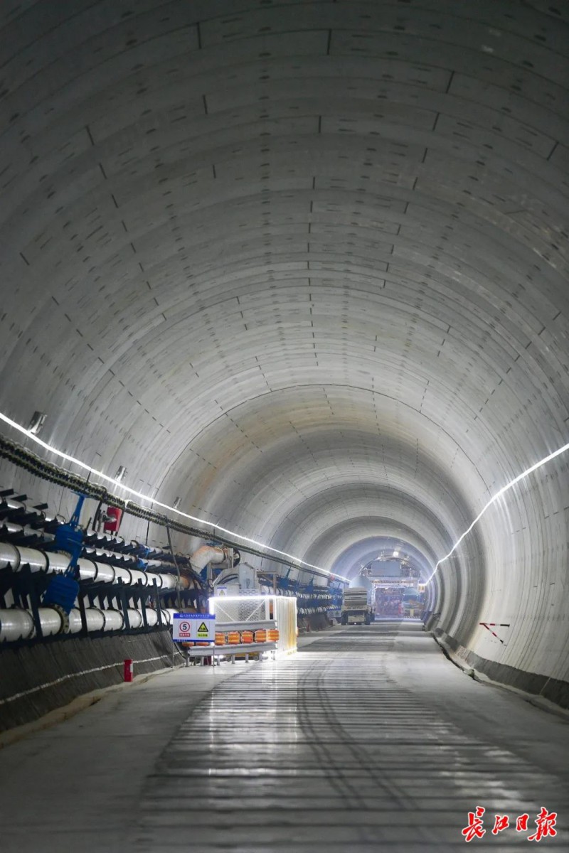 約4層樓高的盾構(gòu)機(jī)內(nèi),10多名施工人員各司其職,緊張忙碌著。有的在連接泥漿循環(huán)管道,有的在遙控拼裝機(jī)拼裝隧道管片,有的在檢查推進(jìn)油缸的液壓管線,有的在更換磨損的刀具……盾構(gòu)機(jī)的身后,下部結(jié)構(gòu)已初步完成的隧道一環(huán)一環(huán)“吐”了出來,形成一條泛著灰色光澤的“時光隧道”。這一越江區(qū)間全長4012米,其中穿越長江段約2160米,是目前國內(nèi)穿越長江的最長地鐵隧道。