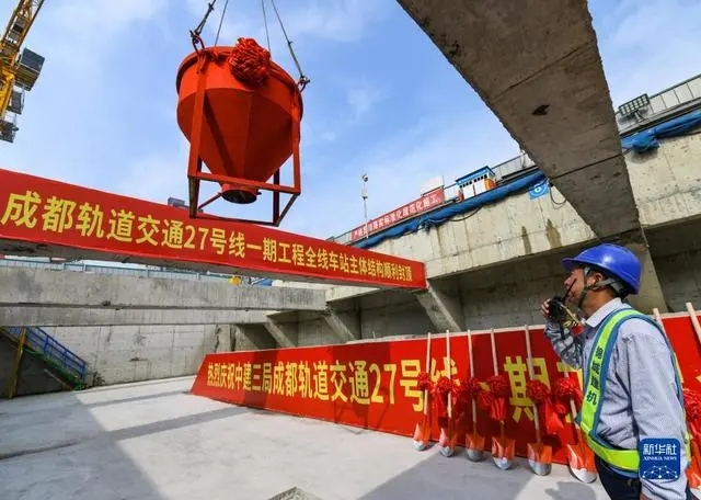 3月21日,在成都地鐵27號線金府站,中建三局的施工人員在指揮塔吊吊裝混凝土?! ‘斎眨S著最后一塊頂板澆筑完成,由中建三局承建的成都軌道交通27號線一期工程金府站主體結構順利封頂。至此,全線23座車站主體結構全部封頂,為全線早日開通奠定堅實基礎?! ?jù)了解,成都軌道交通27號線一期工程線路全長約24.86千米,運營采用無人駕駛技術。線路建成后將加強成都北部區(qū)域與中心城區(qū)聯(lián)系,擴大快速軌道交通服務水平,改善沿線居民公共交通出行條件。