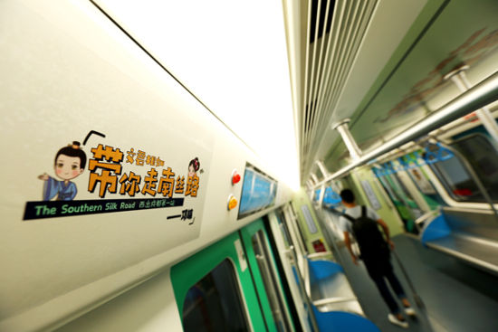 8月15日,一輛“南絲路”主題列車亮相成都地鐵,來自南絲路西出成都第一站——邛崍的卓文君和司馬相如化身萌態(tài)可掬的卡通形象,帶領(lǐng)乘客踏上南絲路之旅。據(jù)悉,從本月15日起,“南絲路”主題列車在成都地鐵1號線正式上線,并將運(yùn)行一個(gè)月。