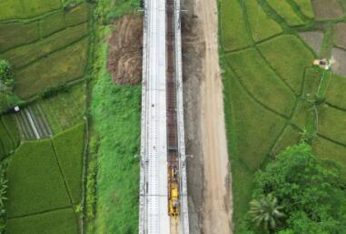雅萬(wàn)高鐵全長(zhǎng)142.3公里,全線鋪軌總長(zhǎng)度308.3公里,均采用中國(guó)生產(chǎn)的500米長(zhǎng)鋼軌,使用全套中國(guó)裝備和先進(jìn)的焊接工藝,鋪軌任務(wù)由中國(guó)鐵路國(guó)際有限公司牽頭的中方施工聯(lián)合體成員單位中國(guó)電建集團(tuán)負(fù)責(zé)。