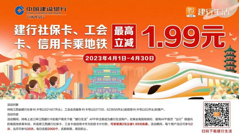 為了更好地便民惠民,建行生活A(yù)PP及中國(guó)建設(shè)銀行APP還配套上線了乘坐南昌地鐵最高立減1.99元優(yōu)惠活動(dòng)(如下圖),真正為百姓的生活注入數(shù)字金融活力。南昌地鐵是作為繼全省公交、全省長(zhǎng)途客運(yùn)汽車之后,中國(guó)建設(shè)銀行江西省分行在建行生活A(yù)PP及中國(guó)建設(shè)銀行APP上接入的又一個(gè)公共交通行業(yè)項(xiàng)目,對(duì)于豐富居民出行場(chǎng)景,完善城市生活服務(wù)體系有著顯著作用。