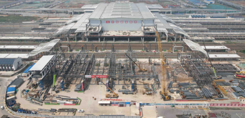 該工程分為兩期建設(shè),一期西站房已于2022年4月28日開通運營,二期東站房工程將于今年5月份進行高架站房、連廊、天橋的整體鋼結(jié)構(gòu)頂推施工。