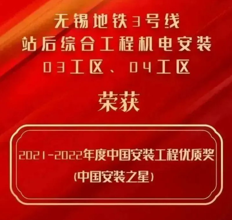 近日,中國(guó)安裝協(xié)會(huì)2021-2022年度中國(guó)安裝工程優(yōu)質(zhì)獎(jiǎng)(中國(guó)安裝之星)頒獎(jiǎng)會(huì)召開,無錫地鐵3號(hào)線工程站后綜合工程機(jī)電安裝兩個(gè)工區(qū)榮獲中國(guó)安裝行業(yè)最高獎(jiǎng)——中國(guó)安裝工程優(yōu)質(zhì)獎(jiǎng)。