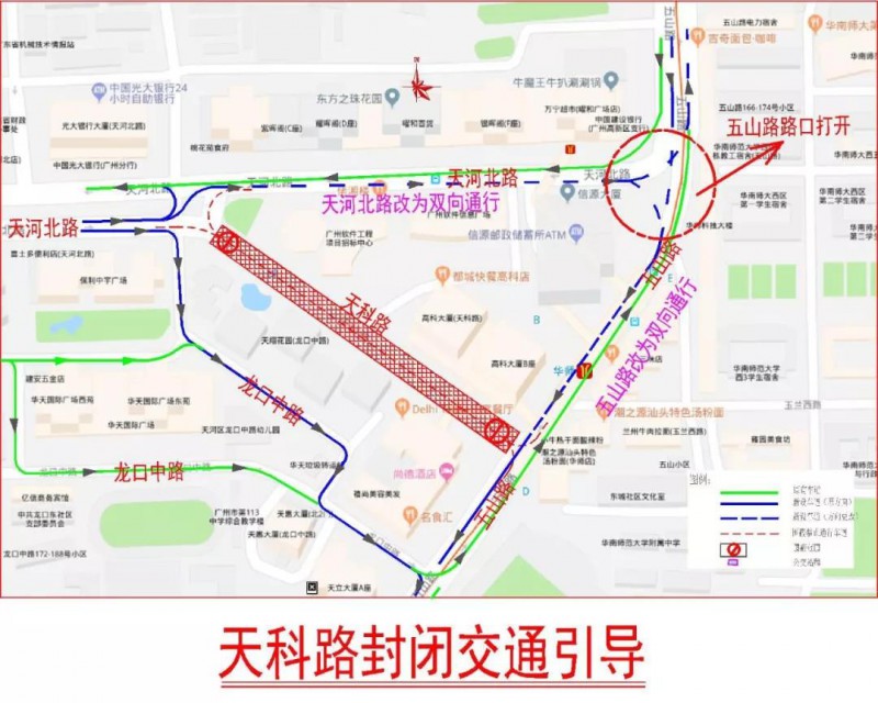 施工期間,天河北路(天科路-五山路路段)將由原來東往西4車道的單行線,擴為5車道雙向行駛,中間車道為可變式潮汐車道;五山路(天科路-天河北路段)由原來北往南3車道的單行線,擴為5車道雙向行駛,其中南行兩車道,北行三車道;同時開放天河北路-五山路路口北往南、西往北、西往南交通。天科路封閉期間,過往車輛可繞行龍口中路或天河北路前往五山路。