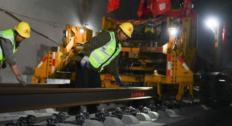 5月22日,中鐵一局建設(shè)者在金甬鐵路樓勝隧道內(nèi)進(jìn)行鋪軌作業(yè)。