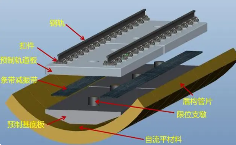 軌道板通俗的講就是列車鋼軌的基礎(chǔ),能夠讓軌道穩(wěn)定的固定在圓形的隧道結(jié)構(gòu)上。傳統(tǒng)軌道施工是采用現(xiàn)澆混凝土方式將軌道和軌枕組成的軌排固定在隧道中。受地鐵隧道場地狹小、作業(yè)環(huán)境差、養(yǎng)護(hù)條件差等因素影響,施工質(zhì)量管控難度大、用工數(shù)量多、效率低下、污染嚴(yán)重,早已無法滿足現(xiàn)階段地鐵工程高質(zhì)量發(fā)展的需求。