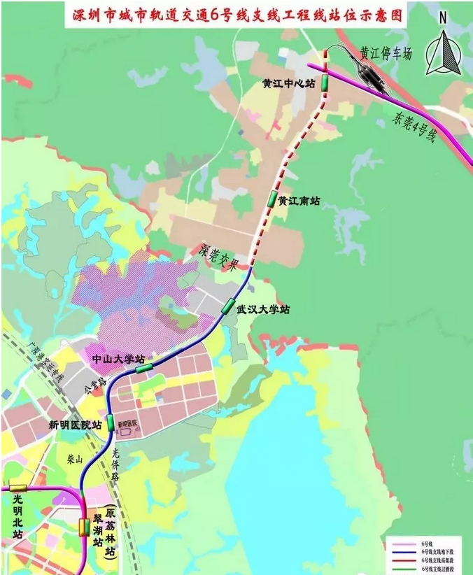 深圳地鐵6號線支線位于深圳市光明區(qū),起點(diǎn)設(shè)在6號線翠湖站東側(cè)(翠湖站為兩線換乘車站)、終點(diǎn)位于公常路深莞邊界,連接光明中心區(qū)和光明北區(qū)、中山大學(xué),與規(guī)劃建設(shè)的東莞1號線南延線銜接,包括4站4區(qū)間:翠湖站(原荔林站)、新明醫(yī)院站、中山大學(xué)站、武漢大學(xué)站。