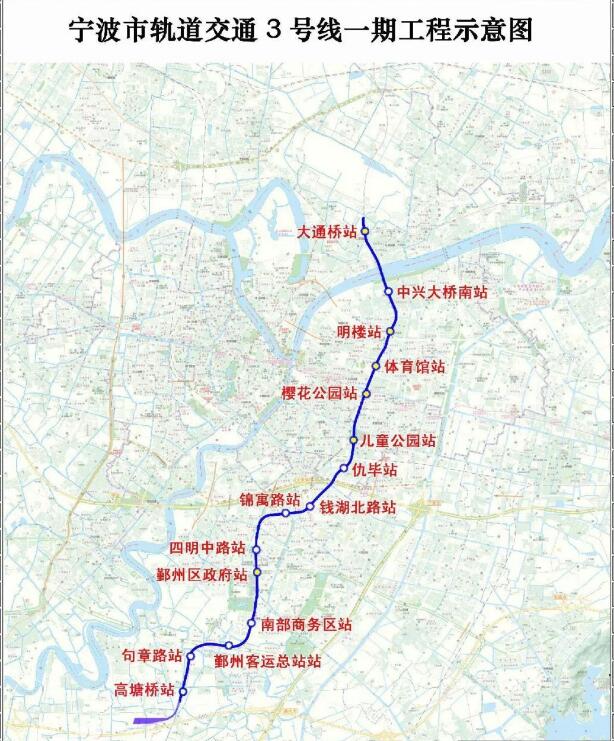 3號(hào)線一期工程從高塘橋至大通橋,共設(shè)15座站,全長16.72公里,途經(jīng)鄞州、江北等地,設(shè)站15座。