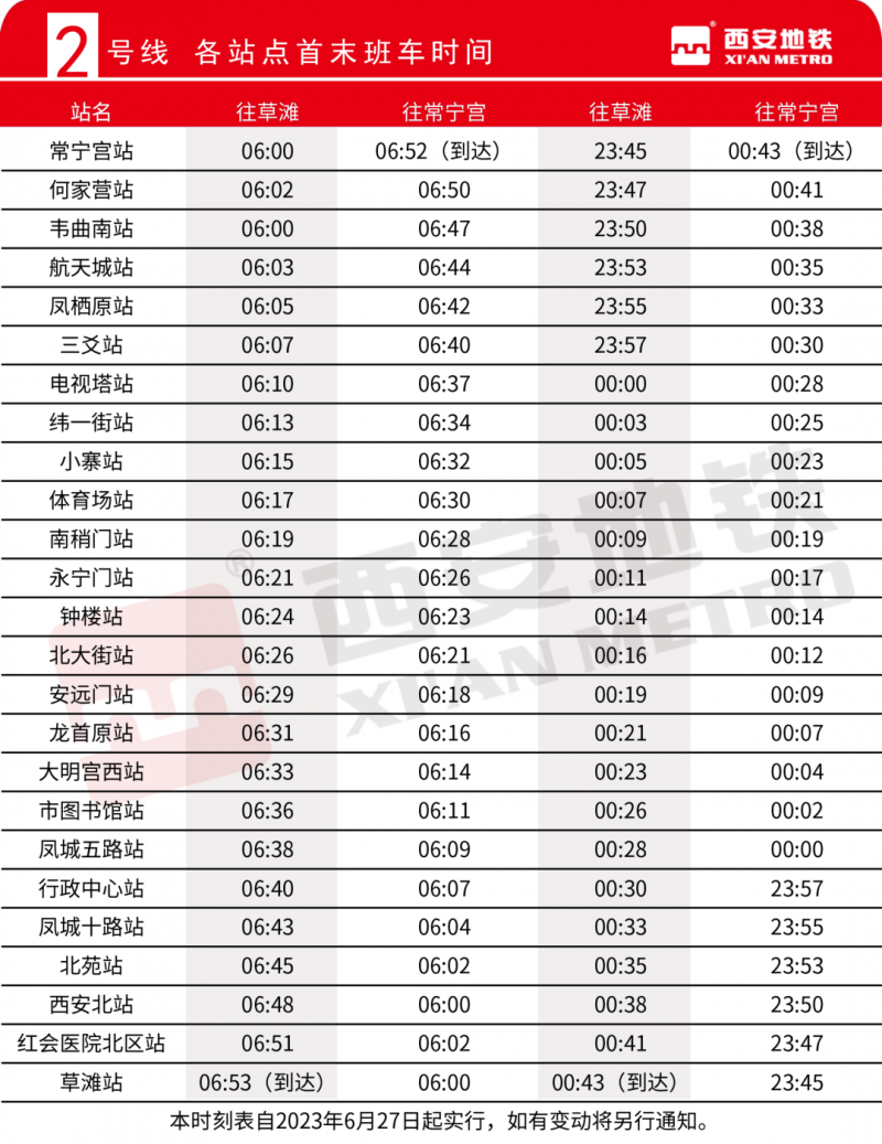 2號線二期開通后與一期貫通運營,首班車采用多點發(fā)車。其中草灘、西安北站開往常寧宮方向的首班車發(fā)車時間為06:00;常寧宮、韋曲南站開往草灘方向的首班車發(fā)車時間為06:00;草灘、常寧宮站末班車發(fā)車時間為23:45;全天運營服務時間為18小時44分鐘。