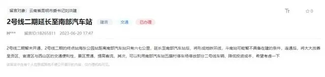 對于網(wǎng)友在人民網(wǎng)—領(lǐng)導(dǎo)留言板建議“將2號線二期延長至南部汽車站”的留言,昆明市交通運輸局7月3日進行了回復(fù)。