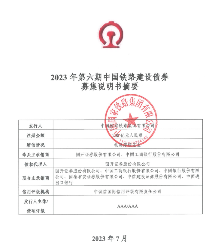 7月11日,據(jù)中國債券信息網(wǎng),中國國家鐵路集團有限公司披露了2023年第六期中國鐵路建設債券相關發(fā)行文件。