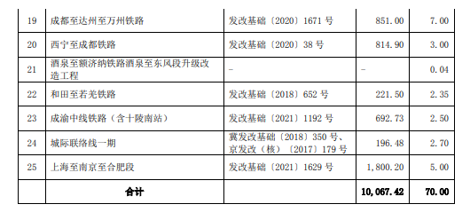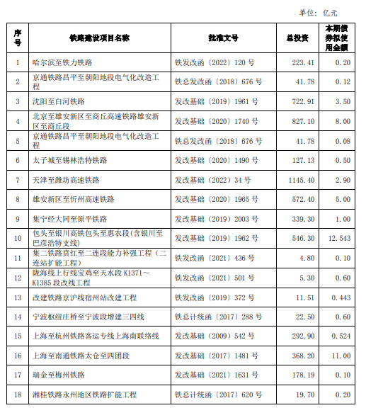 募集說明書顯示,本期債券發(fā)行募集資金200億元,130億元用于債務結構調整,70億元用于北京至雄安新區(qū)至商丘高速鐵路雄安新區(qū)至商丘段、成都至達州至萬州鐵路等項目,具體如下: