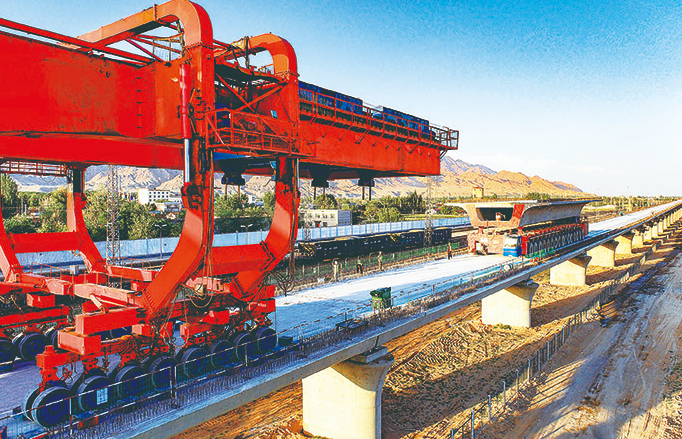 8月8日拍攝的包銀高鐵跨白彥花鐵路專用線特大橋箱梁架設(shè)施工現(xiàn)場。當(dāng)日,由中鐵上海工程局承建的包(頭)銀(川)高鐵跨白彥花鐵路專用線特大橋箱梁架設(shè)任務(wù)完成,標(biāo)志著包銀高鐵巴彥淖爾段首座跨鐵路專用線特大橋主體工程結(jié)束。包銀高鐵設(shè)計時速250公里,計劃2025年建成通車。