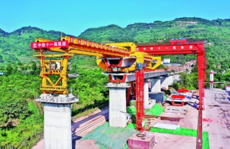 8月15日,在中鐵十一局集團(tuán)承建的渝湘高鐵重慶段建設(shè)現(xiàn)場,隨著作業(yè)人員將首榀重790.25噸的大型箱梁精準(zhǔn)架設(shè)在箭桿灣雙線特大橋19號至20號橋墩上,標(biāo)志著渝湘高鐵重慶段箱梁架設(shè)全面展開。渝湘高鐵重慶至黔江段是國家中長期鐵路網(wǎng)規(guī)劃“八縱八橫”中廈渝通道的重要組成部分,從重慶站引出,途經(jīng)渝中、南岸、巴南、南川、武隆、彭水等區(qū)縣,止于重慶市黔江區(qū),正線全長269.521公里,設(shè)計時速350公里。圖為渝湘高鐵重慶段建設(shè)現(xiàn)場。