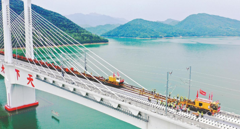 8月21日,在池(州)黃(山)高鐵全線控制性工程太平湖特大橋上,伴隨著陣陣轟鳴聲,中鐵十一局建設(shè)者操控著鋪軌機組將一對500米長鋼軌平穩(wěn)地鋪設(shè)在無砟軌道板上,標(biāo)志著池黃高鐵鋪軌至太平湖特大橋。