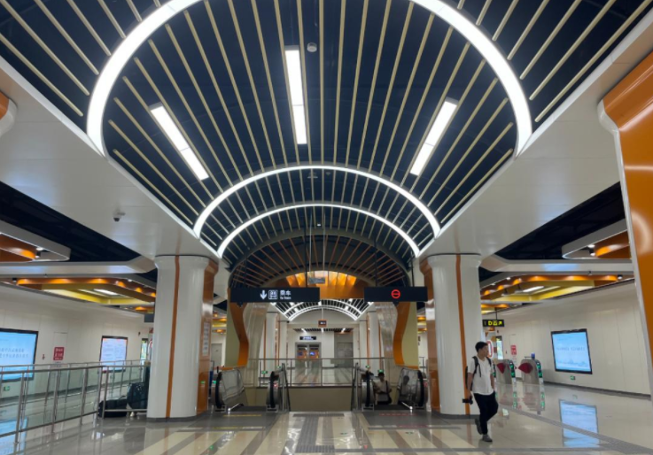 站廳、站臺(tái)層的立柱天花由立體感更突出的鋁板、不銹鋼板、大理石等幾種材質(zhì)搭配而成。棚頂天花板采用彰顯活力的白色、橘色、黃色三種顏色疊加而成。