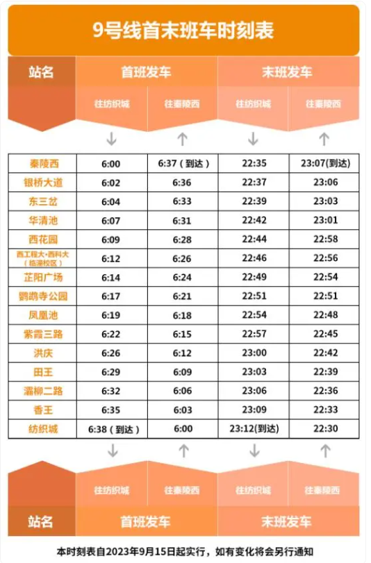 西安地鐵9號線自2023年9月15日起執(zhí)行新版首末班車時刻表。
