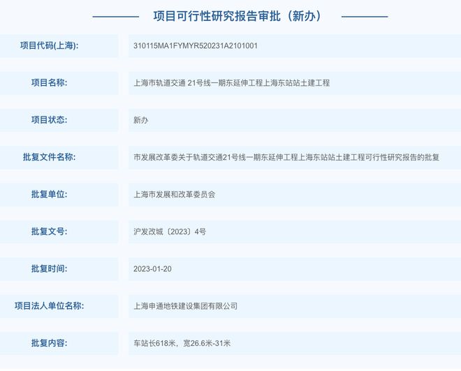 近日,上海市發(fā)改委正式批復(fù)了“上海市軌道交通 21號(hào)線一期東延伸工程上海東站站土建工程”的工程可行性研究報(bào)告,文號(hào)《滬發(fā)改城〔2023〕4號(hào)》。