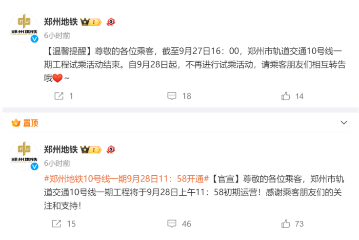 鄭州市軌道交通10號線一期工程今天上午11:58就要開通運營啦!