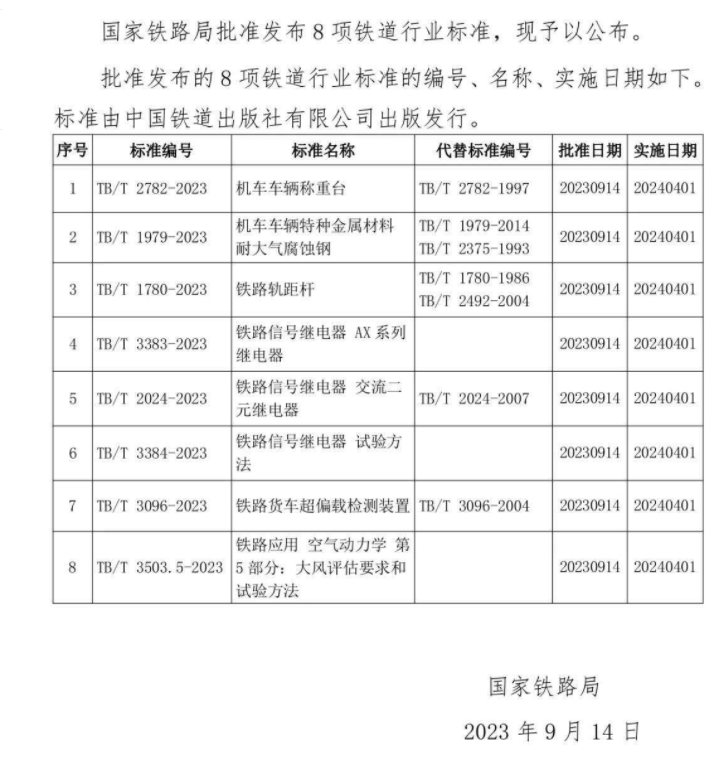 近日,國家鐵路局發(fā)布《機車車輛稱重臺》等8項鐵道行業(yè)標(biāo)準(zhǔn),8項標(biāo)準(zhǔn)中新制定標(biāo)準(zhǔn)3項、修訂標(biāo)準(zhǔn)5項,自2024年4月1日起實施。