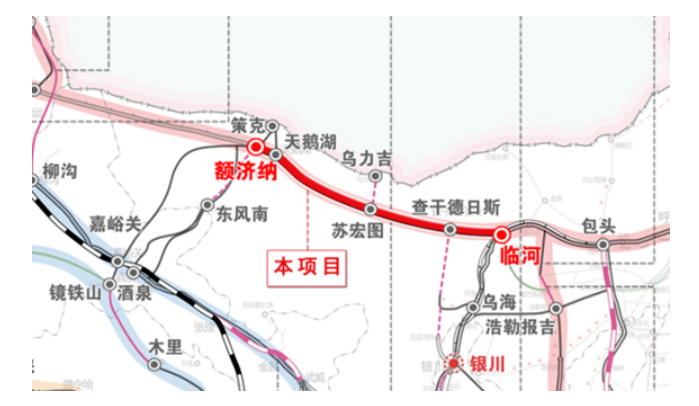 臨哈鐵路臨河至額濟納段改造工程位于內蒙古自治區(qū)西部的巴彥淖爾市和阿拉善盟境內,東起包蘭鐵路的臨河站,終至本項目額濟納站,線路全長683.8公里,總投資約337.9億元,工期2.5年。