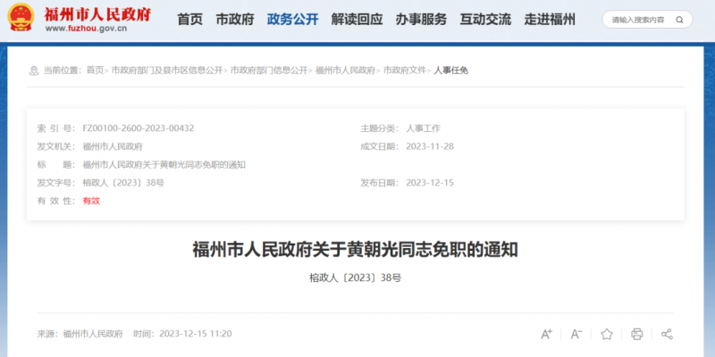 12月15日,福州市人民政府發(fā)布一批人事任免通知。其中,