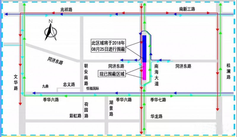 二期交通疏解的范圍包括南海大道與同濟東路路口以及南海大道東側道路(同濟路-華陽橋),導改后南海大道南北方向車流需通過新建鋼便橋后沿臨時道路繞行,同濟東路東西方向車流需沿南海大道繞行,其它方向車流維持現(xiàn)狀不變。