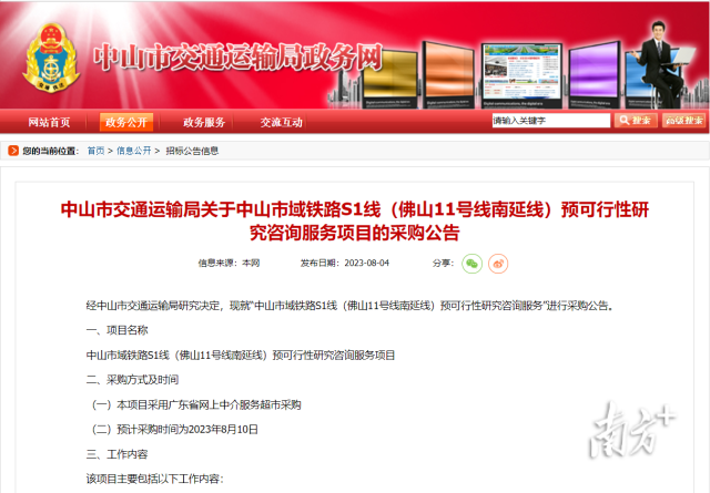 2023年8月,中山發(fā)布中山市域鐵路S1線(xiàn)(佛山11號(hào)線(xiàn)南延線(xiàn))預(yù)可行性研究咨詢(xún)服務(wù)項(xiàng)目的采購(gòu)公告。