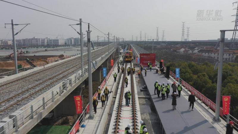 2024年3月2日,在上海市松江區(qū)滬蘇湖鐵路施工現(xiàn)場(chǎng),首對(duì)500米長鋼軌被鋪軌機(jī)鋪設(shè)到無砟軌道床上,標(biāo)志著滬蘇湖鐵路開始全線鋪軌。