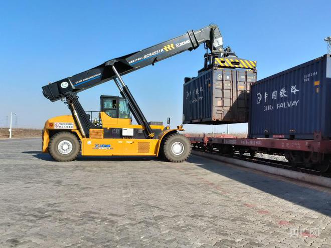 滿載貨物的集裝箱被放上貨物列車(央廣網(wǎng)發(fā) 索鎮(zhèn) 攝)