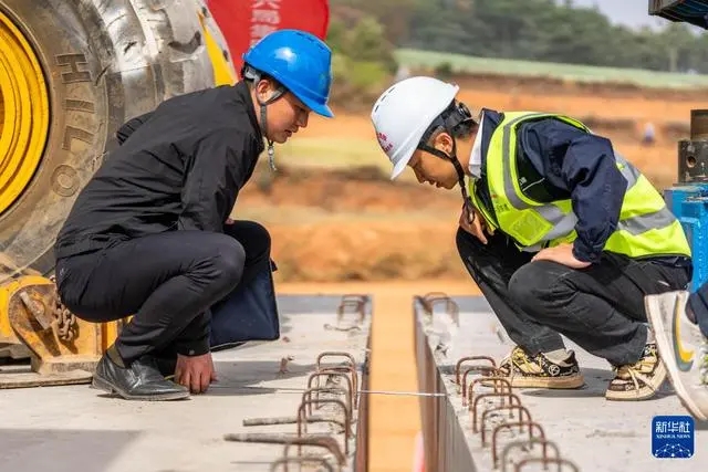 3月22日,監(jiān)理人員在落梁過(guò)程中檢查梁縫寬度是否符合設(shè)計(jì)要求。新華社記者 胡超 攝