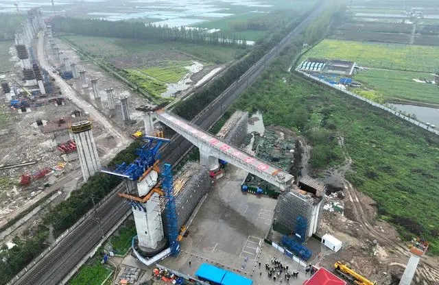 4月2日,滬渝蓉高鐵武宜段漢口至漢川東西南下行聯(lián)絡(luò)線跨漢丹鐵路特大橋轉(zhuǎn)體完成。新華社記者 程敏 攝