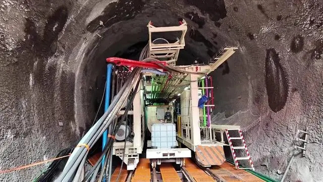 “鐵龍9號”盾構(gòu)機整機重達600噸,主驅(qū)動可達到每分鐘4轉(zhuǎn),曾參與國內(nèi)其他城市地鐵施工,穿越軟弱及硬巖地層,可謂“軟硬通吃”。針對南四區(qū)間地質(zhì)條件復雜,安全管控風險較大、技術水平要求較高等難題,項目團隊深入研究,多方論證,為“鐵龍9號”盾構(gòu)機配置了盾尾間隙測量、土倉可視化、人艙可視化等智能化系統(tǒng)。通過隧道內(nèi)攝像頭的AI算法,實現(xiàn)了軌行區(qū)禁入、人體姿態(tài)監(jiān)測、管片滲漏水識別等智慧功能,確保施工安全平穩(wěn)可靠;同時對渣土資源再利用進行優(yōu)化,采用“渣土分離設備”,實現(xiàn)了渣土再利用、廢棄物零排放等綠色施工。