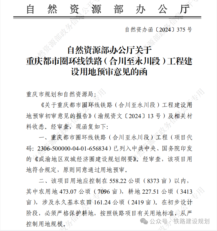 2月28日,自然資源部辦公廳印發(fā)《關(guān)于重慶都市圈環(huán)線鐵路(合川至永川段)工程建設(shè)用地預(yù)審意見的函》,重慶都市圈環(huán)線鐵路(合川至永川段)用地預(yù)審正式獲得自然資源部批復(fù)。這一重大進(jìn)展,為項(xiàng)目可研批復(fù)和年內(nèi)盡早開工建設(shè)奠定了基礎(chǔ)。