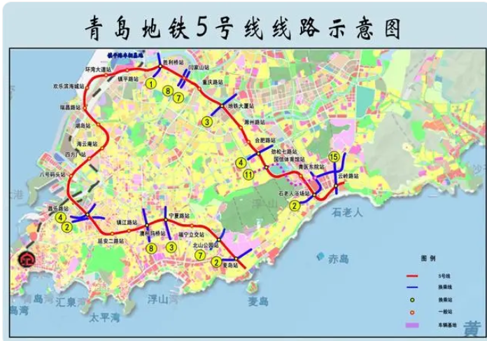 青島地鐵5號線起于麥島站,止于云嶺路站,是串聯(lián)青島中心區(qū)軌道交通網(wǎng)絡(luò)的“C”形線路,線路長約32.6公里,均為地下線,共設(shè)27座車站及1座車輛基地,其中換乘站12座,是青島市目前已規(guī)劃線網(wǎng)中換乘站最多的線路,計劃2028年通車。遠(yuǎn)期5號線繼續(xù)向東沿香港東路延伸至沙子口,延伸段長約7.35公里,設(shè)站4座。