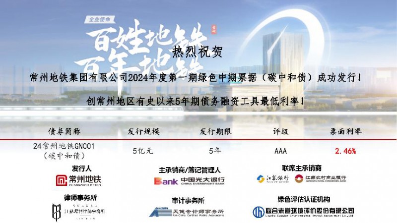 5月30日,常州地鐵集團(tuán)成功發(fā)行2024年度第一期綠色中期票據(jù)(碳中和債),發(fā)行規(guī)模5億元,發(fā)行期限5年,由光大銀行牽頭主承銷,江蘇銀行、江南農(nóng)商行作為聯(lián)席主承銷商,票面利率2.46%,創(chuàng)常州地區(qū)有史以來(lái)同期限中期票據(jù)發(fā)行利率歷史新低。
